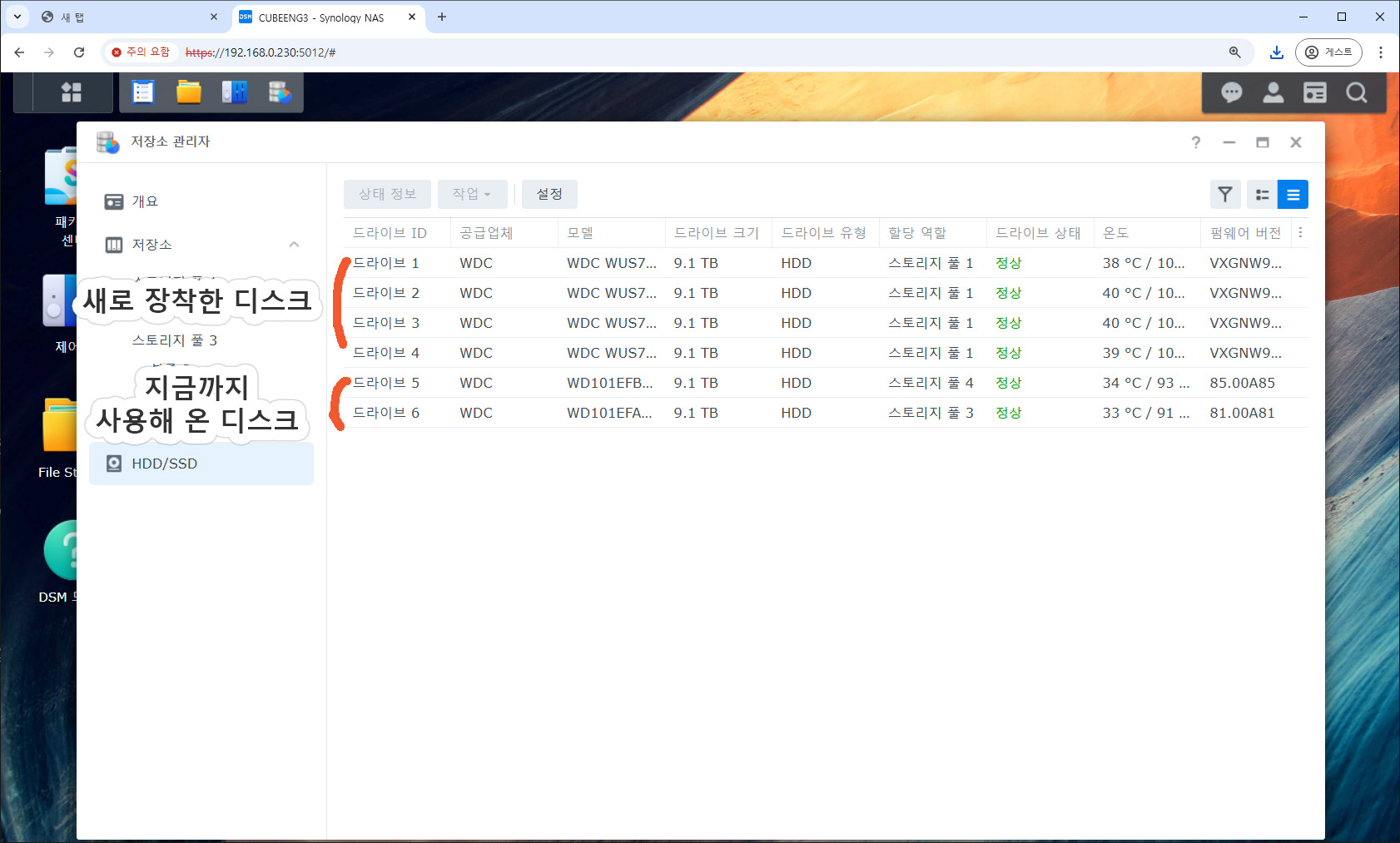 - 기존 나스에서 사용하던 10TB, 10TB 디스크를 장착해서 사용하던 볼륨은 계속 사용할 수 있습니다.