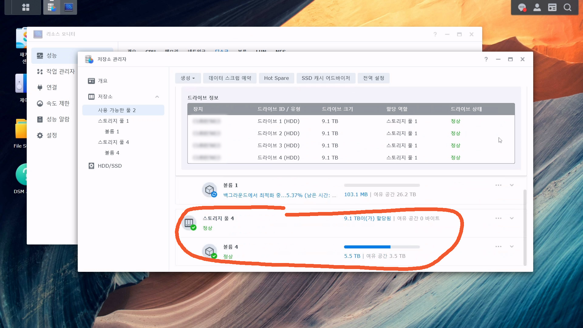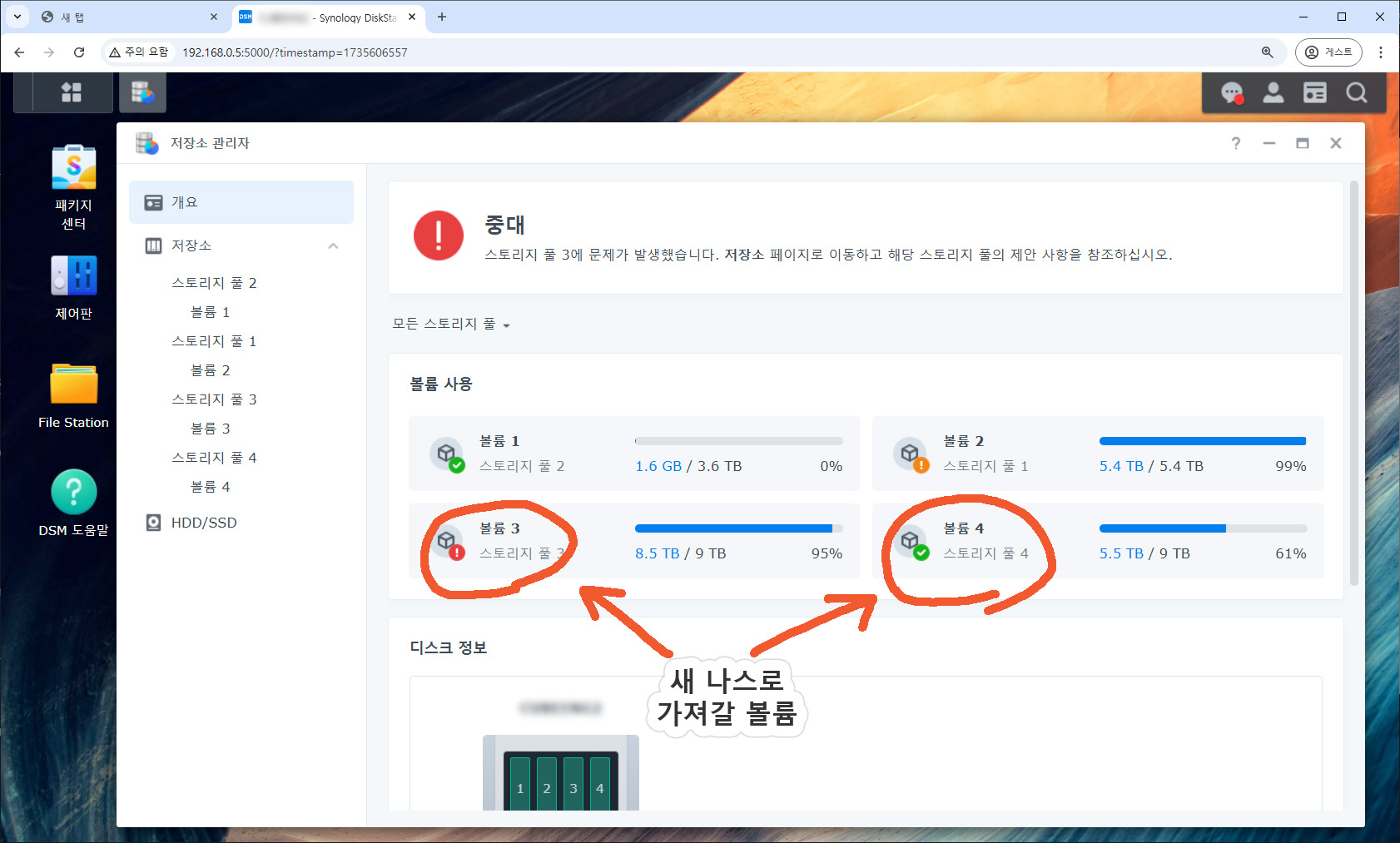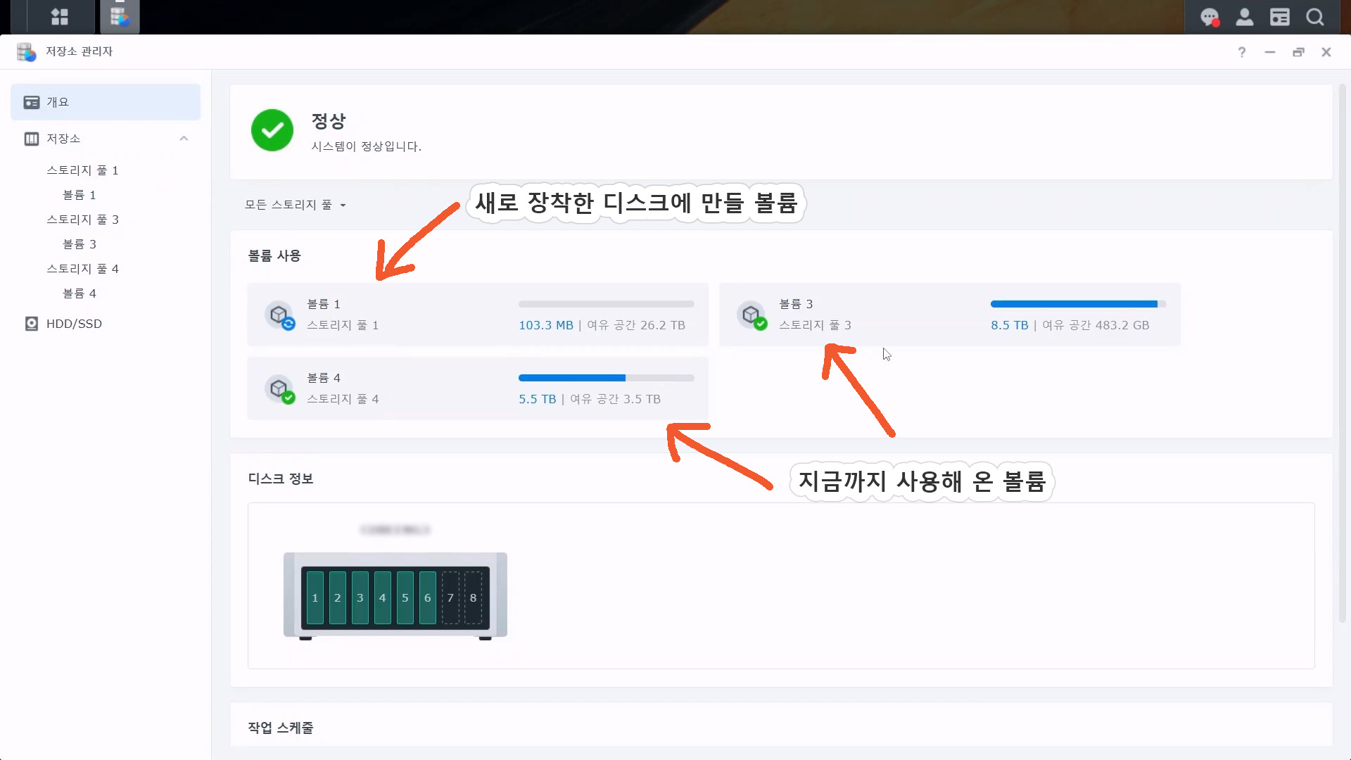 4베이 제품을 사용하고 있는데요. 볼륨의 용량을 늘려야 합니다. 나스를 8베이로 교체해서 그동안 사용해 온 볼륨은 그대로 사용하고, 디스크를 추가로 장착해서 새로운 볼륨을 만들기로 했습니다. 스토리지 풀 어셈블 기능을 사용하면 4베이 제품에서 사용하던 볼륨을 8베이 제품에서도 그대로 사용할 수 있습니다.