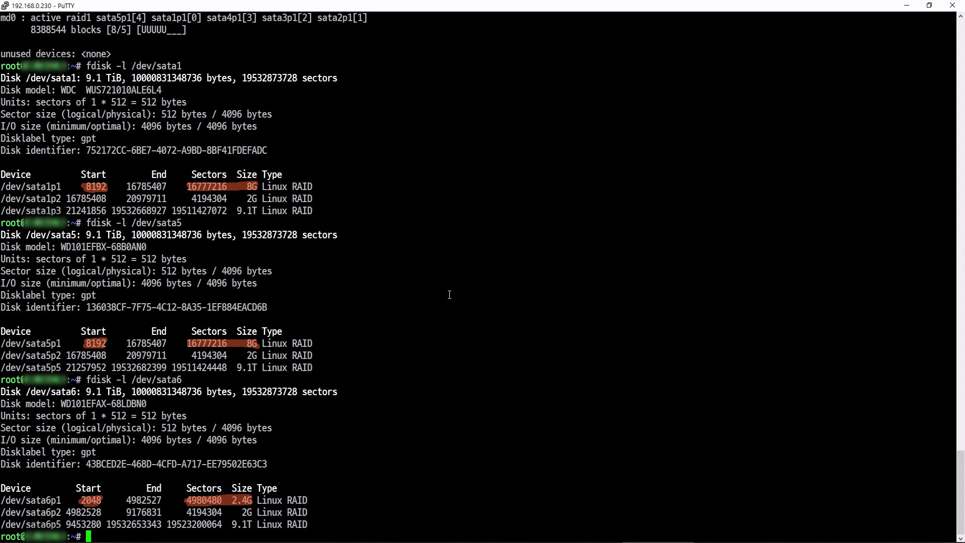 /dev/sata1p3 9437184 19520864255 19511427072 9.1T Linux RAID