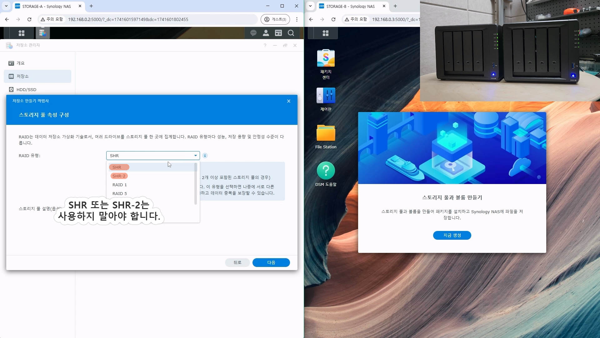 스토리지 풀과 볼륨을 생성합니다. 스토리지 풀을 생성할 때 RAID 유형은 SHR 또는 SHR-2는 선택하지 말아야 합니다. 이 유형은 이중화를 지원하지 않습니다.