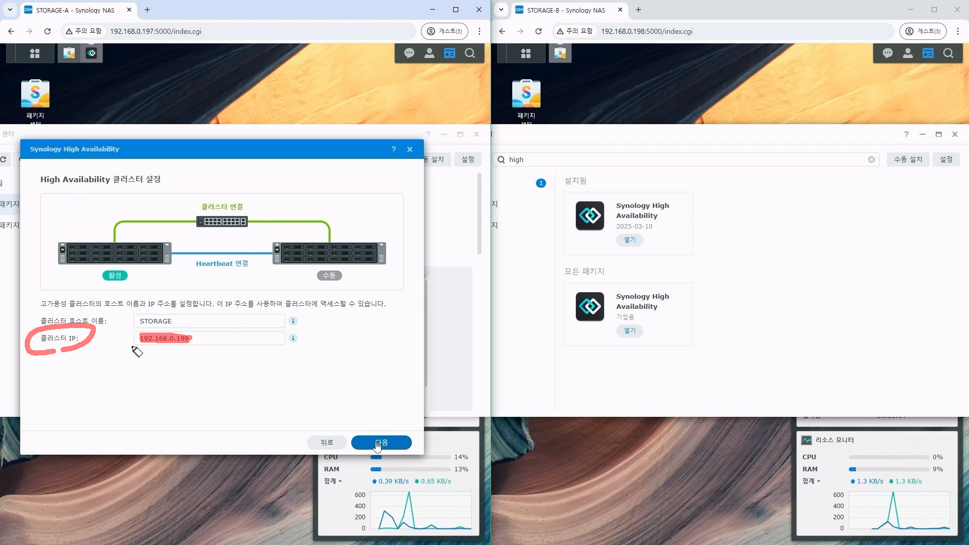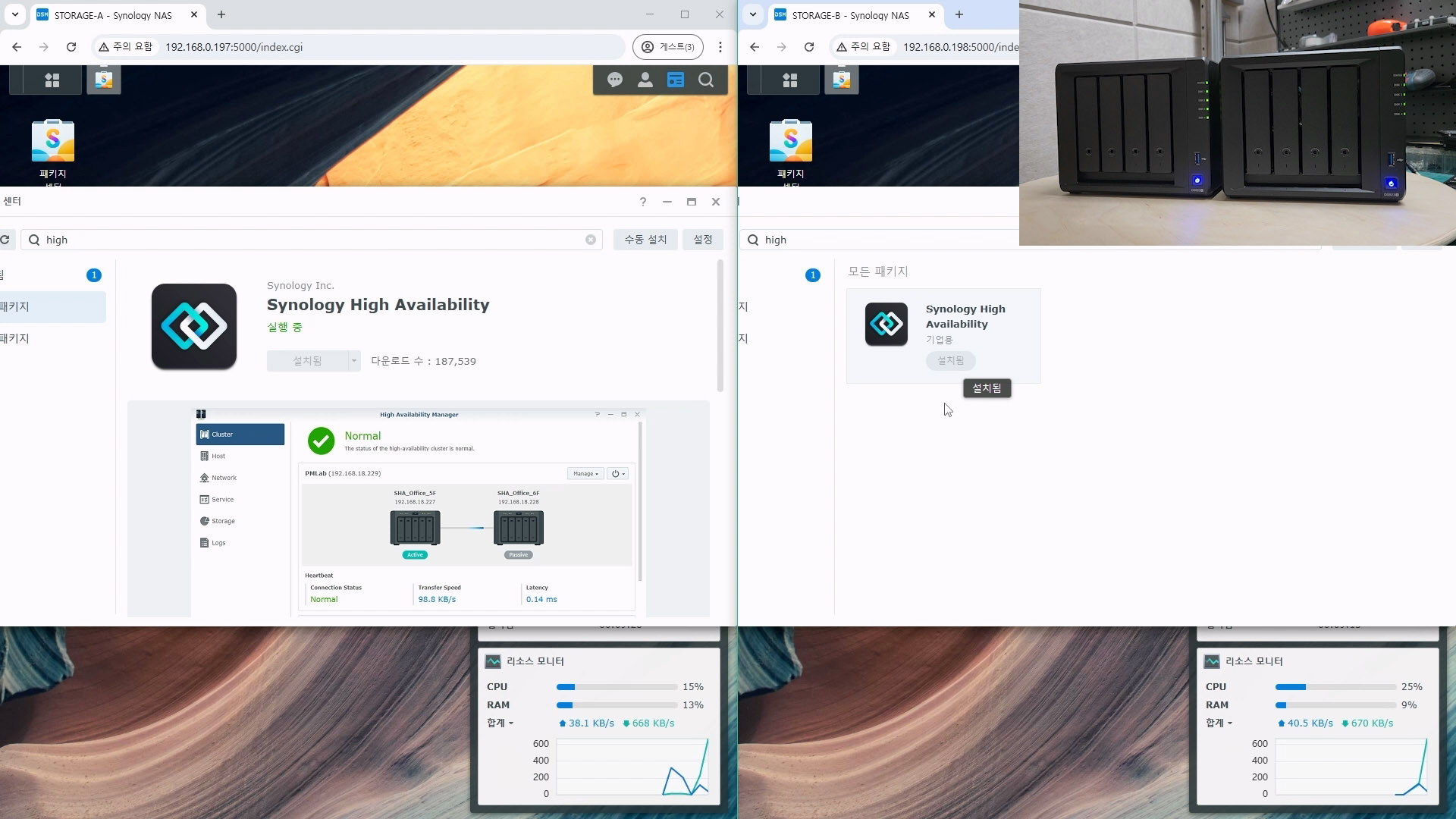 나스 두 대 모두 SHA(Synology High Availability) 패키지를 설치합니다. SHA의 버전은 같아야 합니다. SHA를 실행하고 마법사를 진행하면 클러스터 생성이 완료됩니다.