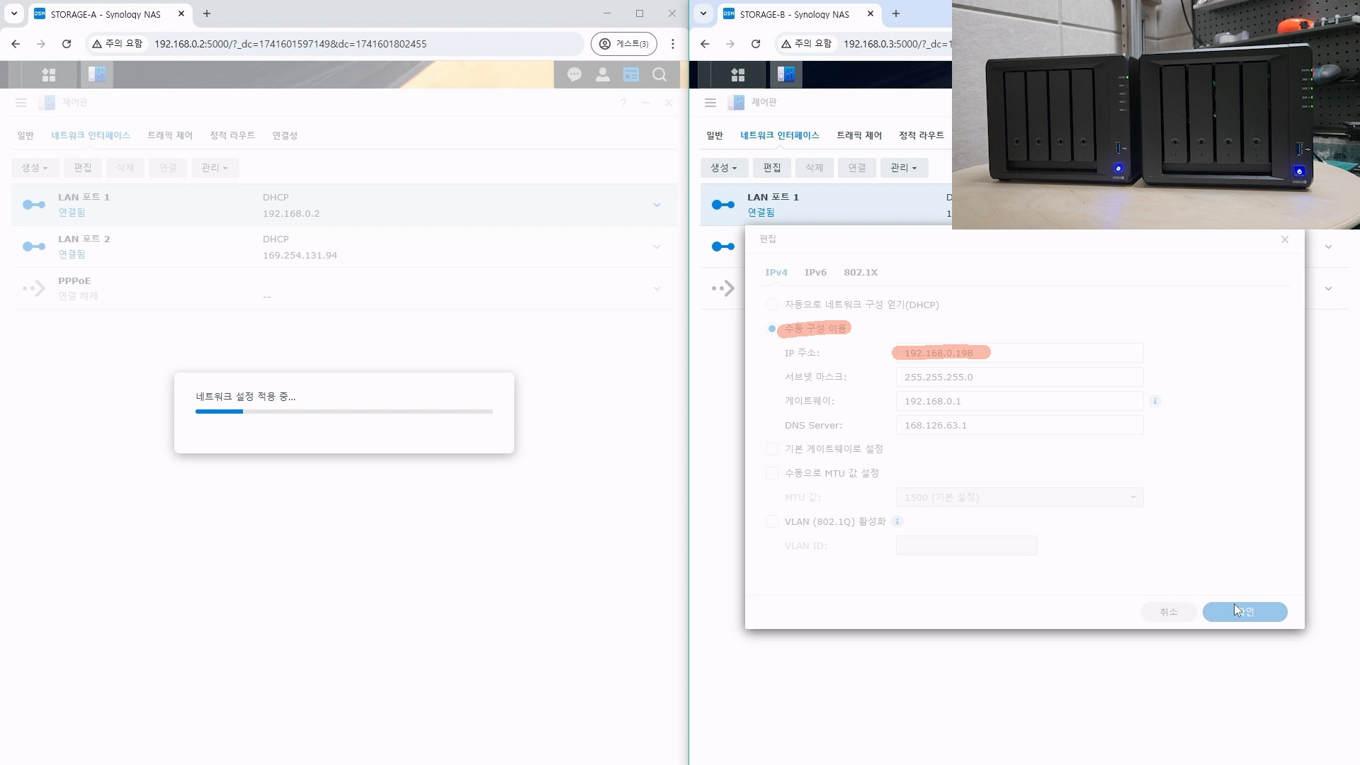 나스 두 대 모두 고정 IP 주소를 설정합니다.