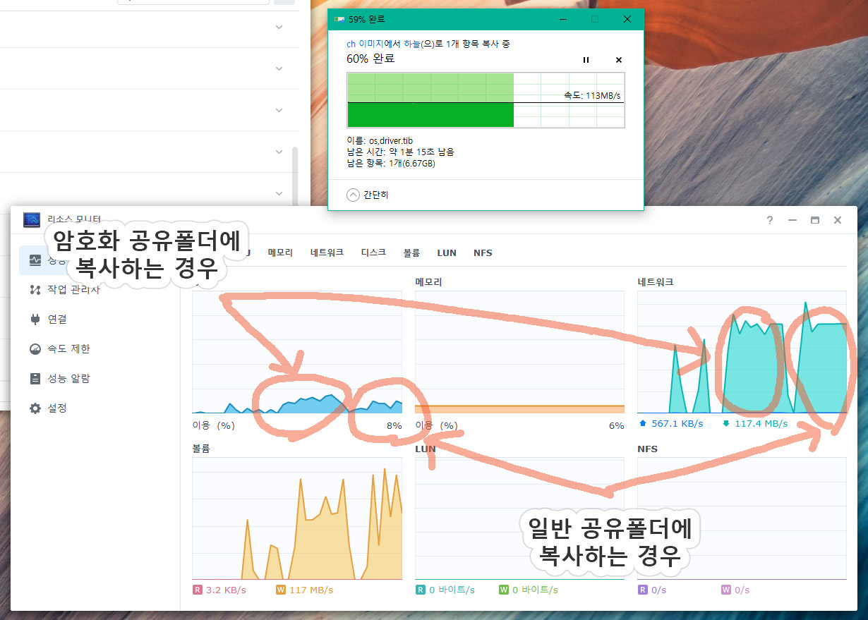 - 단 한 번의 실험 결과여서 신빙성이 떨어지지만, 15GB 크기의 파일을 암호화 공유 폴더와 일반 공유 폴더에 복사했더니 암호화 공유 폴더에 복사할 때는 CPU 사용률이 3% 정도 더 올라갔습니다.