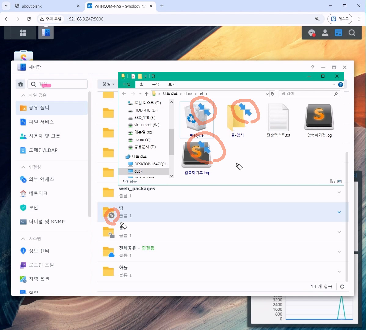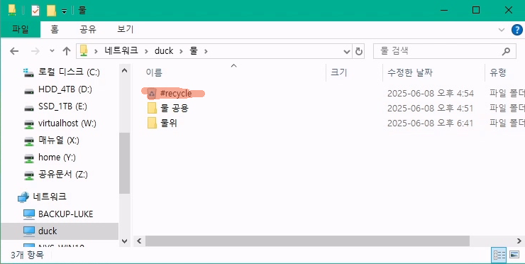 - 공유 폴더에 들어있는 파일이나 폴더를 삭제하면, 삭제 되지 않고 #recycle 폴더로 이동됩니다.