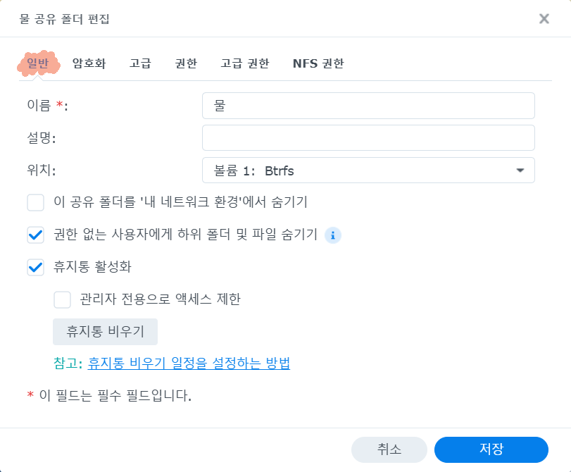 - 휴지통 활성화에 체크하면 공유 폴더 안에 #recycle이라는 이름의 폴더가 생기고, 삭제한 파일이 여기에 보관됩니다.