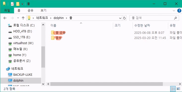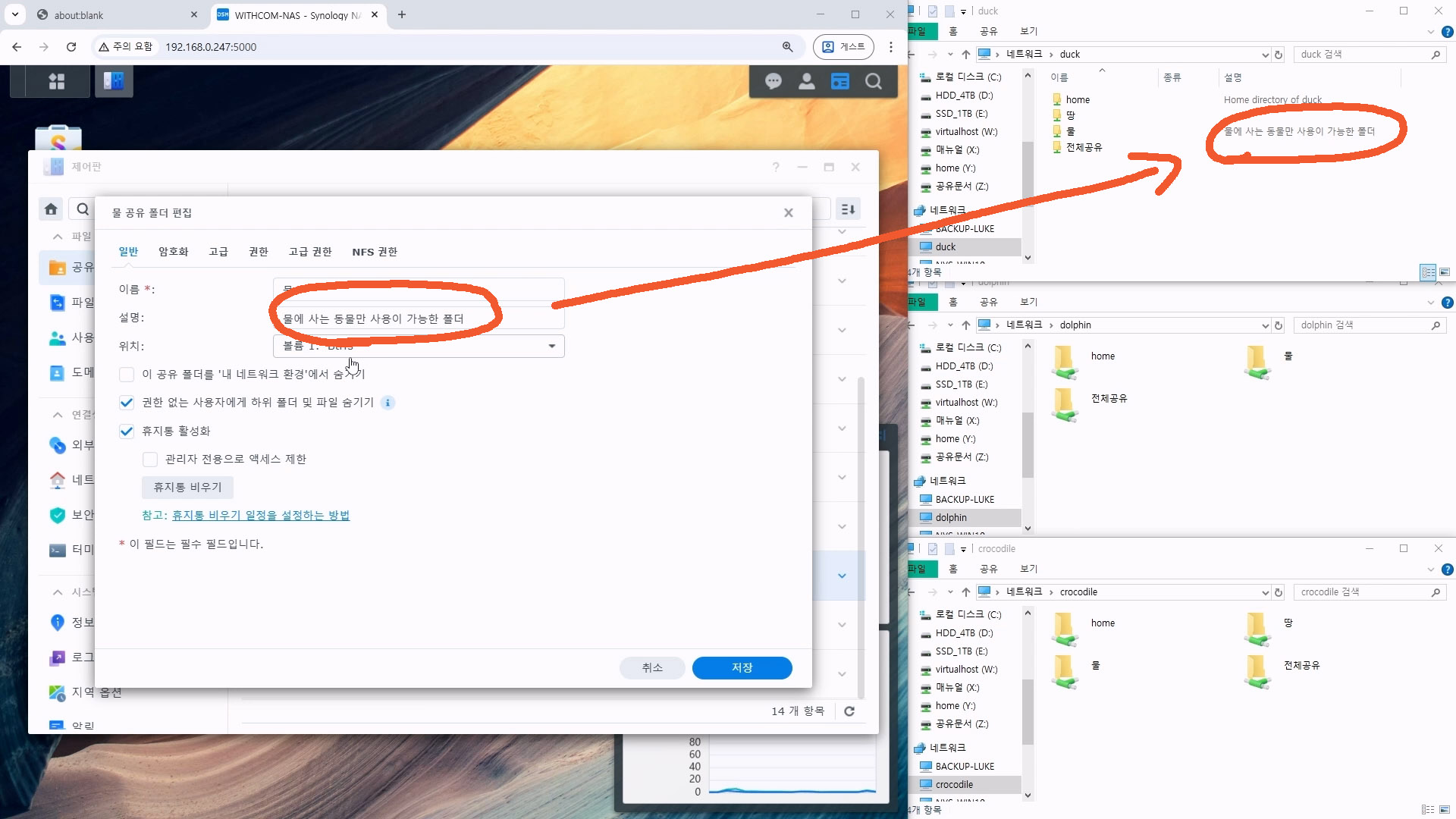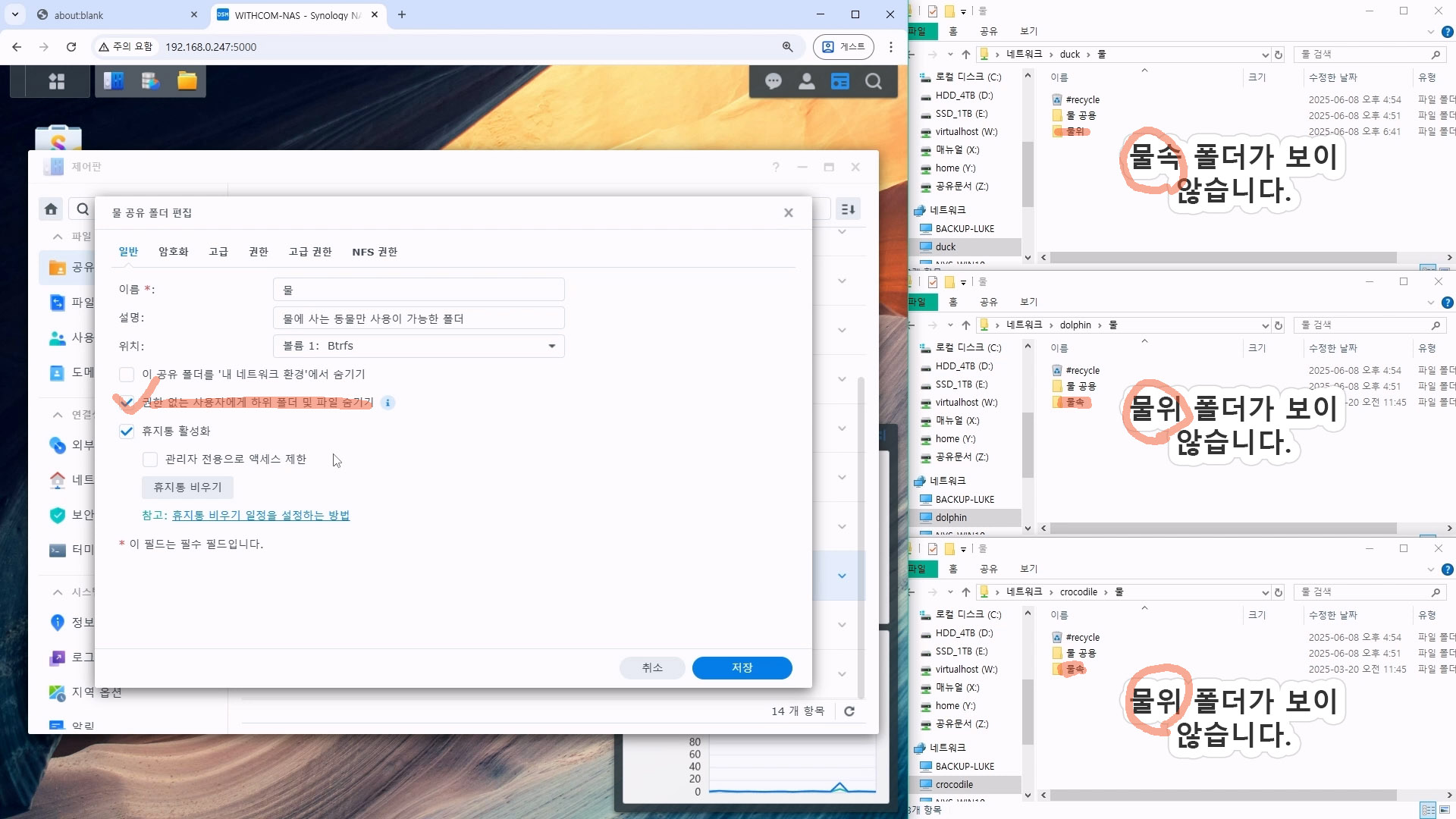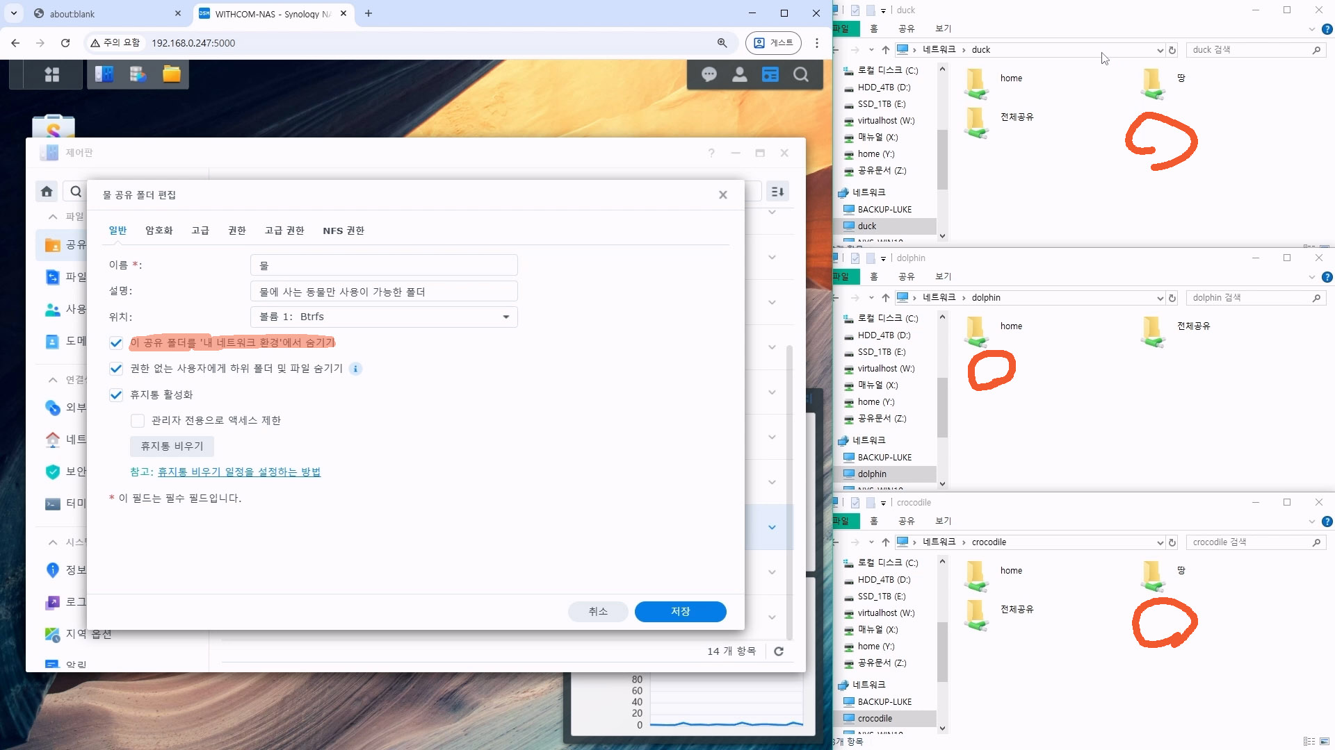 - 눈에 보이지 않을 뿐이지 공유 폴더의 접속을 차단하는 것은 아닙니다. \\나스주소\폴더이름을 직접 입력하면 공유 폴더에 들어가집니다.