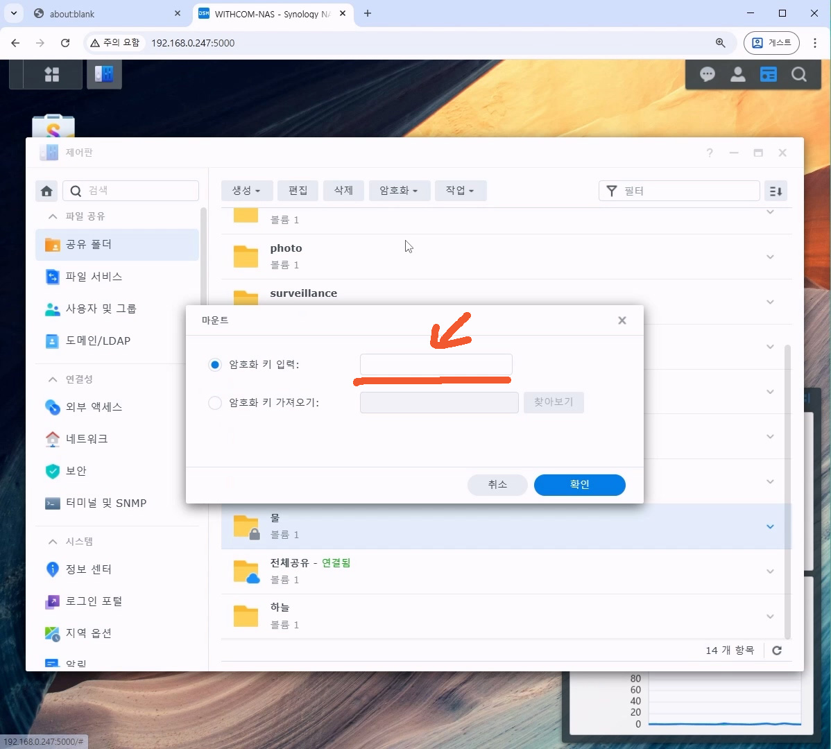- 암호화한 공유 폴더를 사용하려면 마운트 버튼을 클릭하고 암호화 키를 입력하면 됩니다.