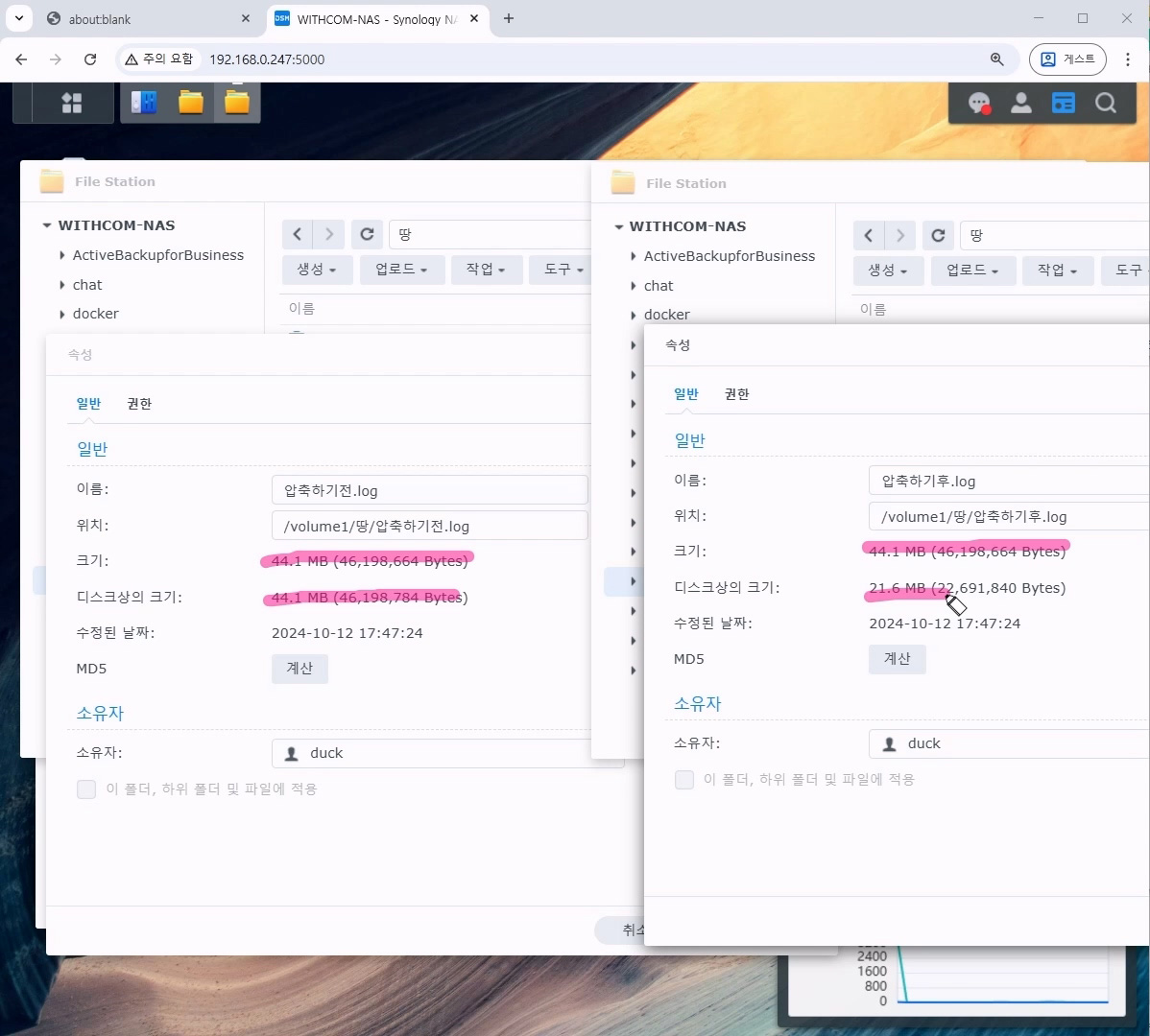 - 1GB 크기의 파일을 가지고 테스트해 봤는데요. 압축 기능을 켰을 때와 껐을 때 파일을 복사하는 속도나 CPU 사용량에 별 차이가 없었습니다. 체감할 정도로 성능이 감소하는 것 같지는 않습니다.